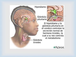 El hipotiroidismo puede ser primario, causado por un aumento del tamaño de la glándula tiroides o problemas autoinmunes, o secundario, causado por una deficiencia de la hormona TSH. Los síntomas incluyen fatiga, aumento de peso, y lentitud mental y muscular. El diagnóstico se realiza midiendo los niveles de TSH y T4 en sangre. El tratamiento consiste en reemplazar la hormona tiroidea faltante de por vida con levotiroxina.
