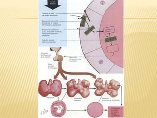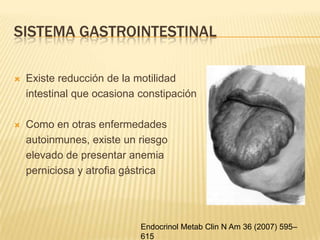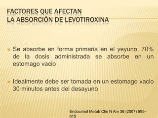 Este documento revisa los puntos clave sobre la presentación clínica, diagnóstico y tratamiento del hipotiroidismo. Explica que la prevalencia aumenta con la edad y es más común en mujeres, y que puede deberse a tiroiditis autoinmune, deficiencia de yodo, cirugía de tiroides o tratamiento con yodo radiactivo. Describe los signos y síntomas del hipotiroidismo, como fatiga, aumento de peso, piel seca y alteraciones cardiovasculares, gastrointestinales y neurológicas. El tratamiento consiste