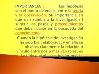 La hipótesis es una proposición que establece relaciones entre variables y guía la investigación. Su importancia radica en que orienta los pasos de la investigación al sugerir la relación entre variables y los procedimientos para buscar conocimiento. Las hipótesis pueden clasificarse como generales, específicas u operacionales, y deben formularse de manera clara, comprobable y en relación con la teoría para evaluar su validez científica.