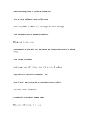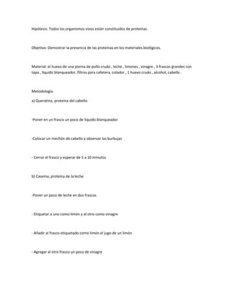 Este documento describe un experimento para demostrar la presencia de proteínas en materiales biológicos como el cabello, la leche, el hueso y la clara de huevo. El objetivo es exponer las proteínas a diferentes condiciones como cambios de pH, temperatura y concentración de sal para observar cómo se comportan y precipitan. El experimento involucra varios pasos como agregar vinagre, limón, alcohol o calor a las muestras y analizar los resultados.
