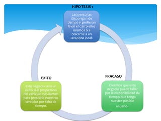 El documento presenta tres hipótesis sobre los posibles factores de éxito o fracaso de un negocio de lavado y cuidado de vehículos. La primera hipótesis plantea que el negocio tendrá éxito si los clientes carecen de tiempo para lavar sus propios vehículos. La segunda hipótesis sugiere que el interés en el cuidado del vehículo determinará el éxito. La tercera hipótesis es que el arraigo a otras opciones de lavado podría causar el fracaso. Se elige la primera hipótes