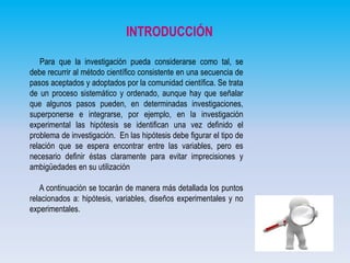 Este documento presenta una introducción a conceptos clave para la investigación como hipótesis, variables, diseños experimentales y no experimentales. Explica que las hipótesis son tentativas de explicación de los fenómenos de estudio y pueden ser de diferentes tipos según su naturaleza y estructura. También define las variables, sus tipos y la importancia de su operacionalización. Por último, describe los diseños experimentales donde se manipulan variables de forma intencional y los diseños no experimentales que observan fenómenos de forma natural.