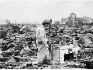 El documento compara los efectos a largo plazo de la bomba atómica lanzada en Hiroshima con los efectos de los políticos, sugiriendo que los políticos pueden causar una destrucción mayor a largo plazo.
