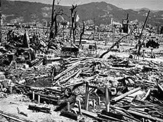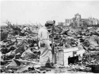 El documento compara los efectos a largo plazo de la bomba atómica lanzada en Hiroshima con los efectos de los políticos, sugiriendo que los políticos pueden causar una destrucción mayor a largo plazo que una sola bomba atómica.