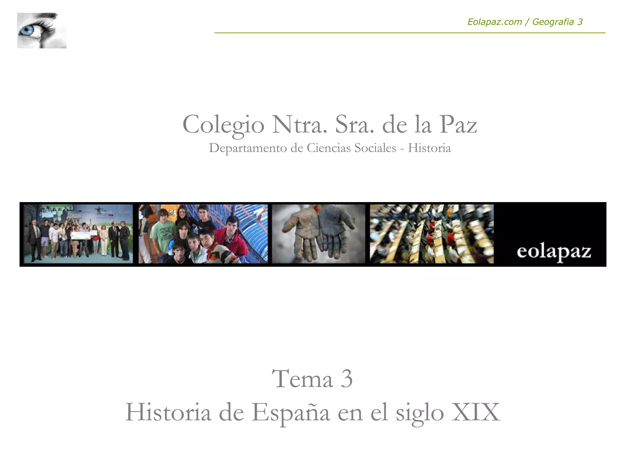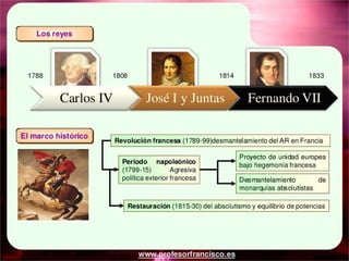 Este documento resume los principales eventos históricos de España en el siglo XIX. Comienza con la crisis del Antiguo Régimen a principios del siglo debido a la Ilustración, la Revolución Francesa y la alianza con Francia. Luego describe la Guerra de Independencia contra Napoleón y el establecimiento de la Constitución de Cádiz. Finalmente, resume los periodos de Fernando VII, Isabel II, la Revolución de 1868, la Primera República y la Restauración borbónica de Alfonso XII.