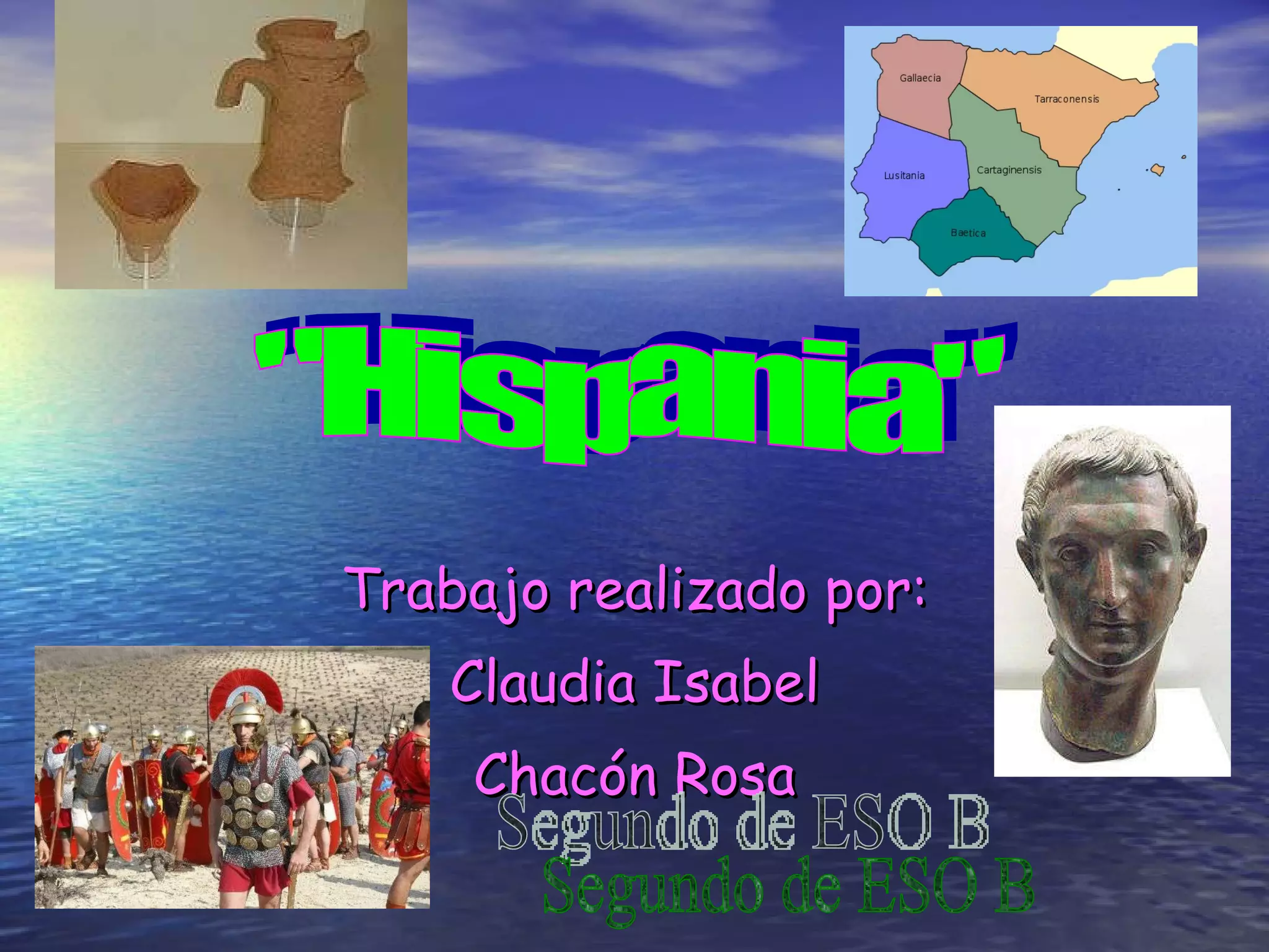 El documento resume la historia de la Hispania romana desde su origen como nombre dado por los fenicios a la península ibérica hasta su decadencia en el siglo III. La Hispania romana abarcaba el territorio español y portugués actual y experimentó un proceso de romanización que transformó la lengua, costumbres, religión y administración. A pesar de la crisis del siglo III, la Hispania romana proporcionó importantes contribuciones a la cultura y política romanas.