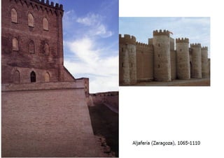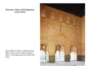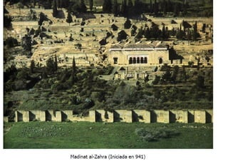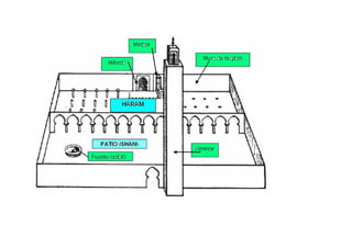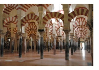 El documento describe los principales rasgos del arte islámico en España. 1) Era esencialmente arquitectónico debido a la prohibición del Corán de representaciones figurativas. 2) Tomó elementos de los pueblos conquistados como el arco de herradura visigodo. 3) Usó materiales pobres como ladrillo, yeso y madera. 4) Los edificios como mezquitas y palacios tenían poca altura pero gran extensión.