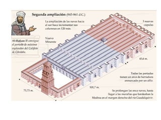 Este documento proporciona información sobre la arquitectura islámica en España entre los siglos VII y XV. Explica los principales períodos, estilos y características arquitectónicas como los arcos, columnas, cubiertas y decoración. También resume los edificios más importantes como la Mezquita de Córdoba, la Giralda y la Alhambra de Granada.