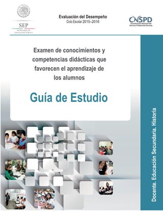 Este documento presenta una guía para apoyar al personal docente en la preparación del Examen de conocimientos y competencias didácticas que favorecen el aprendizaje de los alumnos, el cual forma parte de la Evaluación del Desempeño docente. La guía describe los aspectos a evaluar en el examen, los cuales se centran en el quehacer cotidiano del maestro y corresponden a cinco dimensiones del perfil docente. Asimismo, provee orientaciones sobre la estructura, contenido y preparación del examen.