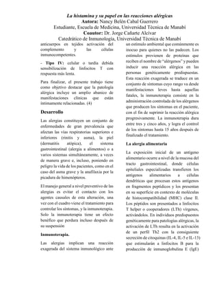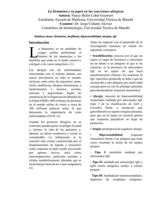 Este documento describe el papel de la histamina en las reacciones alérgicas. Explica que la histamina es liberada por los mastocitos y basófilos cuando entran en contacto con un alérgeno, causando síntomas alérgicos. También describe varios tipos de alergias como asma, rinitis, alergia alimentaria y dermatitis alérgica, así como sus mecanismos inmunológicos y formas de diagnóstico y tratamiento. El documento concluye que la histamina juega un papel