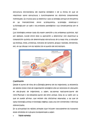 El documento habla sobre la histología, que es la ciencia que estudia la estructura microscópica de los tejidos orgánicos, su desarrollo y funciones. Explica que existen cuatro tipos principales de tejidos: epitelial, conectivo, muscular y nervioso. Se detalla especialmente en el tejido epitelial, incluyendo su clasificación, características, funciones y desarrollo embrionario.