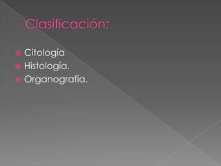 El documento describe los conceptos fundamentales de la histología y la citología. Explica que la histología estudia los tejidos y células a nivel microscópico para comprender sus funciones, y que utiliza técnicas de tinción y microscopía. También resume los pasos clave de la fijación, procesamiento e identificación de tejidos, los cuales son cruciales para preservar la morfología celular.