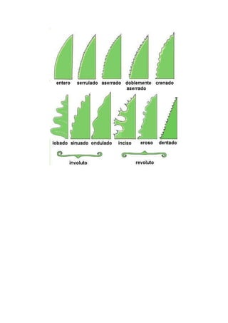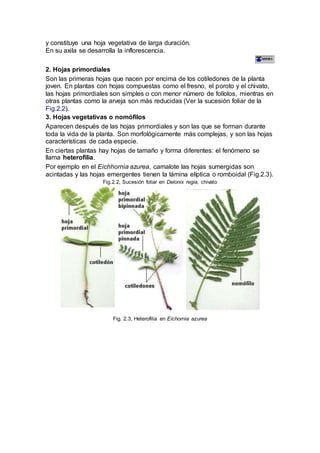 Este documento describe los diferentes tipos de hojas que se desarrollan en las plantas, incluyendo las hojas embrionales, primordiales, vegetativas y otras. Explica la sucesión foliar y las partes de la hoja de las dicotiledóneas, así como la organización, forma, margen y venación de las hojas. Se definen términos como hoja simple, compuesta, entera, lobada, y se ilustran los diferentes tipos de venación mayor como craspedódroma, camptódroma y actinódroma.
