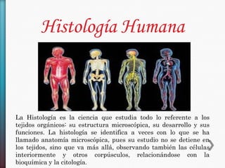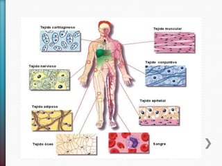 El documento describe los diferentes tipos de tejidos del cuerpo humano, incluyendo epitelial, conectivo, muscular y nervioso. Explica la estructura y función del tejido epitelial, conectivo no especializado y especializado, muscular y nervioso. También describe las células que componen estos tejidos como fibroblastos, adipocitos y diferentes tipos de células gliales y musculares.