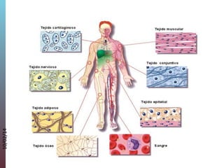 El documento resume los principales tipos de tejidos que componen el cuerpo humano, incluyendo el epitelial, conectivo, nervioso, muscular y sanguíneo. Describe la estructura, función y células de cada tejido.