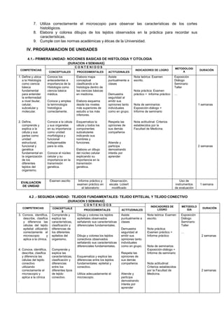 Este documento presenta el sílabo de la asignatura Histología I. La asignatura tiene una duración de 17 semanas y busca que los estudiantes comprendan los tejidos normales como base para identificar las alteraciones en la enfermedad. El sílabo describe los objetivos de aprendizaje, las unidades temáticas incluyendo nociones básicas de histología, tejido epitelial y tejido conectivo, y los métodos de evaluación.