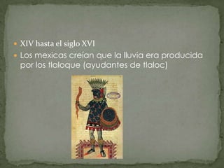 Los mexicas creían que la lluvia era producida por los tlaloque entre los siglos XIV y XVI. Migaron al Altiplano Central entre los siglos XII y XIV, estableciendo su origen mítico en Aztlán. En el siglo XVI, la cuenca lacustre de Tenochtitlan se extendía sobre 8,000 km2, de los cuales una octava parte estaba compuesta de lagos. Creían que los cerros dominaban la formación de nubes hace aproximadamente 3,500 años.