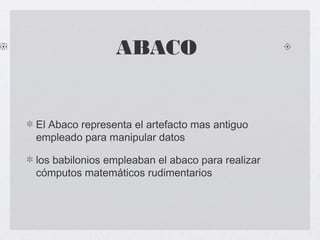 El documento describe la historia de las computadoras desde los primeros dispositivos de cálculo como el ábaco utilizado por los babilonios hasta el desarrollo de las primeras computadoras modernas en el siglo XX. Algunos hitos importantes incluyen la máquina analítica de Charles Babbage en el siglo XIX, el uso de tarjetas perforadas por Joseph Marie Jacquard y Hermann Hollerith, y el desarrollo de las primeras computadoras electromecánicas como la MARK I en Harvard en 1944.