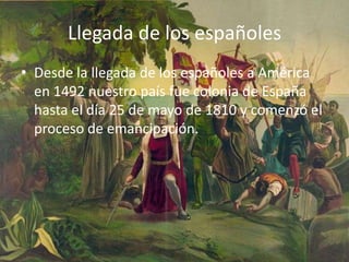 La llegada de los españoles en 1492 marcó el comienzo de la colonización de Argentina por España. En 1810, los criollos propusieron la revolución para lograr la independencia política y cambiar el régimen económico que solo beneficiaba a los españoles. El 25 de mayo de 1810 se formó una junta provisional presidida por Mariano Moreno para gobernar el país, dando inicio al proceso de emancipación de España que culminó con la declaración de independencia el 9 de julio de 1813.