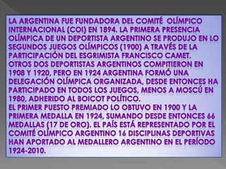 La historia del deporte en Argentina comenzó a fines del siglo XIX con la introducción de deportes británicos como el rugby y el fútbol. A partir de la década de 1970, deportes como el tenis, el polo y el hockey sobre césped alcanzaron gran popularidad en el país. La Argentina se ha destacado a nivel internacional en los Juegos Olímpicos y en otros eventos deportivos mundiales, especialmente en fútbol, boxeo, rugby y polo.