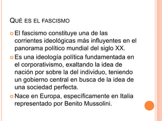 El documento resume el surgimiento del fascismo en Italia y Alemania en las primeras décadas del siglo XX. Explica que el fascismo es una ideología que exalta la nación por sobre el individuo y busca una sociedad jerárquicamente organizada. Surge en Italia bajo Benito Mussolini como respuesta al malestar social producido por la crisis económica y el incumplimiento de las promesas de territorio luego de la Primera Guerra Mundial. En Alemania, Adolf Hitler y el partido Nazi capitalizan el resentimiento por la derrota en la gu
