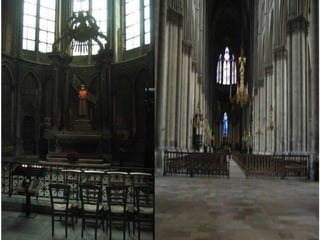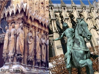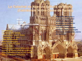 La Catedral de Reims es una catedral gótica francesa construida entre 1211 y 1311. Sus características incluyen arcos apuntados, vidrieras, rosetones, gabletes y chapiteles. Mide 38 metros de altura en la nave central y 86 metros en las torres. Contiene 1303 estatuas escultóricas y destaca por su unidad de estilo a pesar de su largo período de construcción de más de dos siglos.
