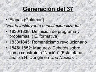 El documento describe las principales etapas de la formación del Estado argentino entre 1829 y 1880, incluyendo la Etapa Rosista, la Confederación y Buenos Aires, y la Formación del Estado. Analiza los debates ideológicos entre las generaciones del 37 y del 80 sobre cómo construir la nación y el tipo de orden político y económico requerido. Explica cómo luego de Caseros surgió la necesidad de construir un Estado nacional capaz de insertarse en el sistema internacional y articular los intereses económicos dentro de la nación.