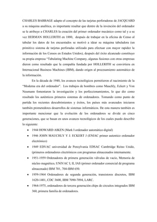 El documento resume la historia de la informática, desde los primeros dispositivos calculadores manuales hasta los ordenadores digitales modernos. Destaca las contribuciones de pioneros como Napier, Pascal, Babbage, Hollerith y otros, y describe las cinco generaciones de ordenadores desde las válvulas de vacío hasta los chips de circuitos integrados y la inteligencia artificial. Finalmente, señala que Internet y los ordenadores actuales son herramientas ubicuas en diversos campos como la educación y los negocios.