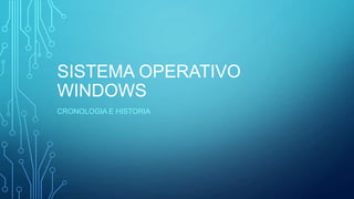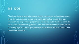 Este documento resume la cronología e historia de los sistemas operativos Windows de Microsoft, comenzando con MS-DOS y progresando a través de versiones como Windows 1.0, 3.0, 95, 98, ME, XP, Vista, 7, 8 y 8.1. Cada nueva versión introdujo mejoras de interfaz gráfica y funcionalidad, desde las primeras versiones basadas en línea de comandos hasta las interfaces gráficas modernas.