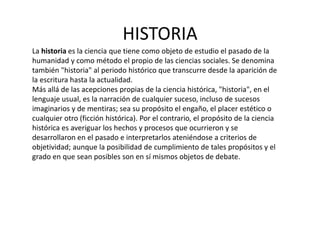 La historia es la ciencia que estudia el pasado de la humanidad utilizando métodos de las ciencias sociales. Se refiere tanto a la disciplina académica como al periodo histórico desde la aparición de la escritura. Aunque algunos historiadores no aceptan que sea una ciencia social por reducir sus métodos y objetivos, la mayoría en el siglo XX y XXI la consideran una disciplina científica. Existen debates sobre si la historia es una ciencia humanística o un puente entre ciencias y humanidades.