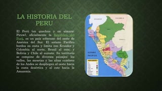 El documento describe brevemente la historia del Perú, dividida en cuatro etapas: Imperio, Conquista, Independencia y República. El Perú es un país soberano ubicado en el oeste de América del Sur, con costas al océano Pacífico y territorio que incluye selvas, mesetas y montañas de los Andes.
