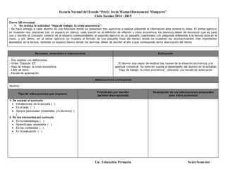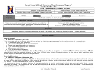 Este documento presenta las secuencias didácticas de una clase de historia para estudiantes de sexto semestre de licenciatura en educación primaria. La lección se enfoca en explicar la situación económica y la apertura comercial en México, incluyendo las causas y consecuencias de la crisis económica, la inflación y la expansión urbana. La clase consta de tres partes: inicio, desarrollo y cierre, e incorpora actividades, lecturas, videos y una hoja de trabajo para evaluar el aprendizaje de