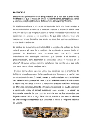 El documento discute el uso de la narrativa para enseñar historia. Explica que cada persona interpreta los eventos históricos de manera única dependiendo de su entorno y experiencias. También señala que la narrativa da sentido al pasado y ordena el caos de la realidad. Recomienda que la enseñanza de la historia debe incluir estrategias como la reflexión crítica usando narrativas de los estudiantes. Finalmente, propone que los estudiantes también puedan crear sus propias narrativas y practicar así el pensamiento históric