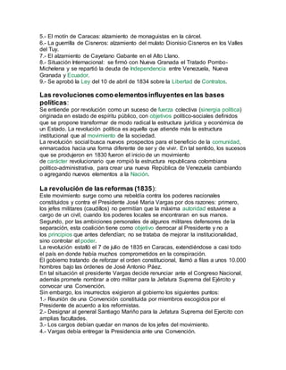 Durante el periodo de 1830 a 1884, Venezuela pasó de ser dominada por los colonizadores a ser dominada por una oligarquía de terratenientes y caudillos militares. La sociedad continuó siendo atrasada y la mayoría de la población fue excluida del sistema político debido al alto índice de analfabetismo. La economía adoptó las ideas liberales de libre mercado. El país experimentó varias revoluciones entre facciones rivales que luchaban por el poder.