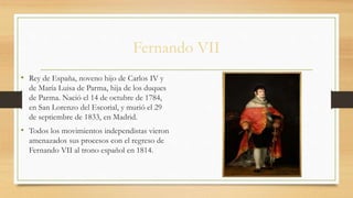 El documento proporciona información sobre varias figuras históricas españolas e hispanoamericanas, incluyendo Fernando VII, rey de España entre 1814-1833; Simón Bolívar, libertador de los países de América del Sur; y José de San Martín, general argentino que luchó por la independencia de Chile y Perú. También discute el impacto de la Revolución Francesa en el reinado de Carlos IV de España y el papel de Francisco Javier de Elío como gobernador y partidario del absolutismo de Fernando VII.