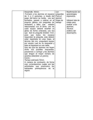 El documento presenta el plan de estudios para una lección sobre los primeros habitantes de la entidad de Sinaloa, México. La lección se enfocará en distinguir las características de la vida cotidiana de los primeros habitantes de la región. La maestra utilizará varias actividades interactivas como un memorama y preguntas con globos para involucrar a los estudiantes. Evaluará su comprensión a lo largo de la lección y al final.