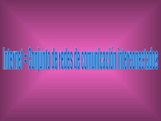 El documento resume la historia del Internet, comenzando con su primera conexión establecida en 1969 como la red ARPAnet financiada por la Agencia de Proyectos de Investigación Avanzada de EE.UU., luego el desarrollo de protocolos en 1973 que le dieron el nombre de "Internet", y su crecimiento a través de redes como NSFNET en 1986 y el primer proveedor comercial en 1983, hasta alcanzar 100.000 millones de usuarios en 2006 y proveer acceso a información a millones de personas hoy en día.