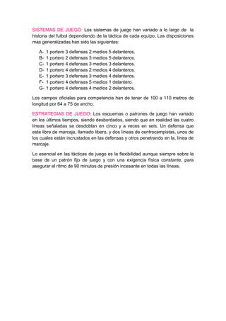 El documento resume la historia y organización del fútbol. Explica que sus orígenes se remontan a los niños jugando con objetos como piedras o latas. El primer reglamento se estableció en 1843 en la Universidad de Cambridge. Actualmente, los equipos constan de 11 jugadores divididos en porteros, delanteros, mediocampistas y defensas. El objetivo es anotar goles introduciendo el balón en la portería contraria. A lo largo de la historia han existido diferentes sistemas de juego dependiendo de la táct
