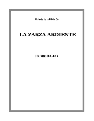 El documento resume el capítulo bíblico del Éxodo donde Dios se le aparece a Moisés en una zarza ardiente que no se consumía. Dios le dice a Moisés que lo ha elegido para liberar al pueblo de Israel de la esclavitud en Egipto y llevarlos a la tierra prometida. Moisés duda de ser la persona adecuada debido a su tartamudez, pero Dios lo convence con señales como convertir su bastón en una serpiente y curar su mano leprosa.