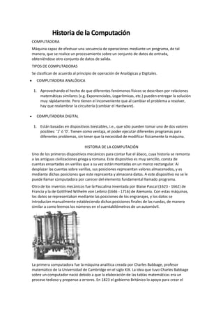1) El documento describe la historia de las computadoras desde los primeros dispositivos mecánicos de contar hasta las generaciones de computadoras modernas. 2) Se destacan hitos como la máquina analítica de Charles Babbage en el siglo XIX, la ENIAC electrónica en 1947, y el desarrollo de los lenguajes de programación y circuitos integrados en generaciones posteriores. 3) Finalmente, la cuarta generación trajo los microprocesadores y las primeras computadoras personales creadas por Steve Jobs y Steve Wozniak.