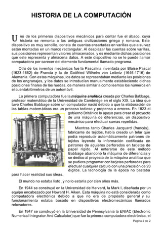 El documento resume la historia de la computación desde los primeros dispositivos mecánicos de contar como el ábaco hasta el desarrollo de las primeras computadoras electrónicas en la década de 1940. Explica que Charles Babbage diseñó la primera computadora programable mecánicamente en el siglo XIX y que la ENIAC fue la primera computadora electrónica en 1947. También describe las primeras generaciones de computadoras, desde las primeras basadas en tubos de vacío hasta las de transistores y lenguajes de alto nivel en la década de