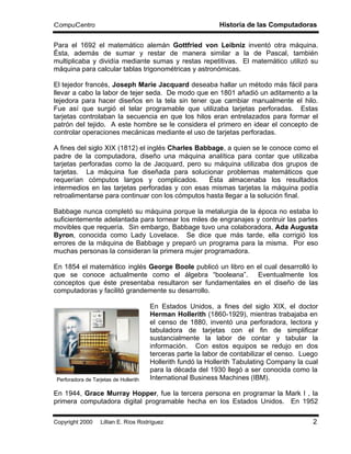 El documento resume la historia del desarrollo de las computadoras desde los primeros métodos de cálculo como el ábaco hasta la era de las computadoras personales. Destaca hitos como la invención de las primeras máquinas mecánicas de cálculo en los siglos XVII-XIX, el desarrollo de las primeras computadoras electrónicas en la primera mitad del siglo XX utilizando tubos de vacío, y los avances tecnológicos como los transistores, circuitos integrados y microprocesadores que llevaron al des