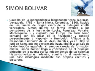 Simón Bolívar fue un líder de la independencia de las colonias hispanoamericanas que dirigió la guerra por la independencia de Venezuela y otros países. Francisco de Paula Santander fue un líder de la independencia de Colombia que colaboró con Bolívar y se desempeñó como vicepresidente de la Gran Colombia. José Antonio Páez fue un militar venezolano que luchó en batallas clave para la independencia y murió a causa de heridas sufridas en combate.