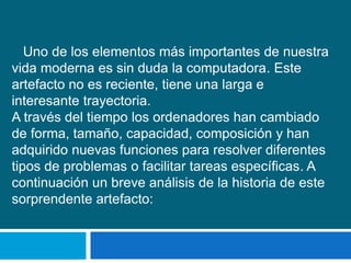 El documento describe la historia y evolución de los dispositivos computacionales a través del tiempo, desde los primeros dispositivos mecánicos hasta las computadoras modernas. Explica las cuatro generaciones de computadoras y los eventos más importantes de cada una, como el uso de transistores y chips de silicio. También define las diferentes clases y categorías de computadoras, incluyendo analógicas, digitales y de propósito general u especial.