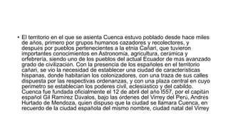 Cuenca fue fundada en 1557 por el capitán español Gil Ramírez Dávalos bajo órdenes del Virrey del Perú. Durante la época colonial, Cuenca estuvo apartada de los principales centros virreinales de Lima y Bogotá. Proclamó su independencia en 1820 pero fue reprimido por las tropas españolas hasta la llegada de las tropas libertadoras de Sucre. Actualmente es una de las ciudades más dinámicas del Ecuador conocida por su cultura, artesanías e industrias.