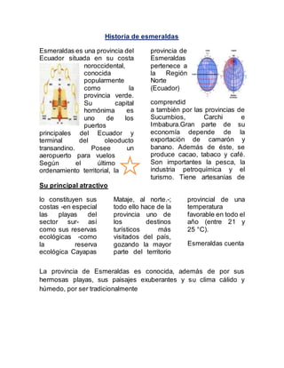 La provincia de Esmeraldas se encuentra en la costa noroccidental de Ecuador, conocida como la provincia verde. Su economía depende principalmente de la exportación de camarón, banano, cacao y otros productos agrícolas. Esmeraldas también tiene industrias pesqueras, petroquímicas y turismo, atrayendo visitantes con playas, reservas ecológicas y un clima cálido todo el año.