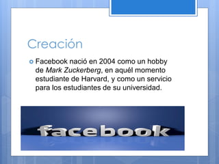 Facebook fue creado en 2004 por Mark Zuckerberg como un sitio para los estudiantes de la Universidad de Harvard. Comenzó como un sitio para comparar fotos de estudiantes y luego evolucionó a una red social completa que permite compartir actualizaciones, fotos y videos. Facebook ha crecido rápidamente y ahora ofrece muchos servicios como chats, grupos, juegos y una tienda de aplicaciones. La clave de su éxito ha sido conectar a las personas de una manera que maximice las interacciones sociales.