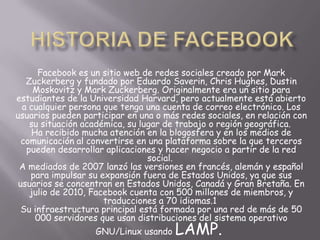 Facebook es un sitio de redes sociales creado por Mark Zuckerberg y fundado por él y otros compañeros de Harvard. Originalmente era solo para estudiantes de Harvard pero ahora está abierto a cualquier persona con una cuenta de correo. Facebook ha recibido atención por permitir a terceros crear aplicaciones en la plataforma y ha expandido a idiomas como francés, alemán y español para crecer fuera de EE.UU. En 2010 tenía 500 millones de miembros en 70 idiomas usando una infraestructura de más de 50,000 servidores Linux.