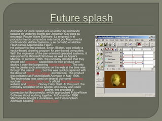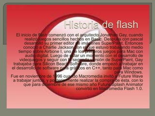 El documento describe la historia y el desarrollo de Flash a través de los años. Comenzó como un editor de imágenes llamado FutureSplash Animator creado por Jonathan Gay. En 1996, Macromedia compró FutureWave y FutureSplash Animator se convirtió en Macromedia Flash 1.0. Flash ha ido mejorando con cada nueva versión a través de las capacidades de scripting, soporte para audio y video, y compatibilidad con plataformas móviles y web. Actualmente es propiedad de Adobe.