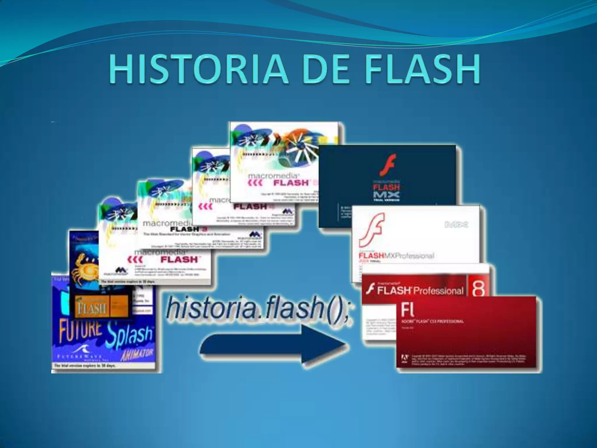 Flash comenzó como una herramienta de animación llamada FutureSplash Animator desarrollada por FutureWave Software. Fue adquirida por Macromedia en 1996 y renombrada como Flash. Con el tiempo, Flash se hizo popular para animaciones en la web y se convirtió en un plugin estándar. En 2005, Adobe adquirió Macromedia y Flash. Flash ha ido mejorando con cada nueva versión para permitir la creación de contenido interactivo multimedia para la web.